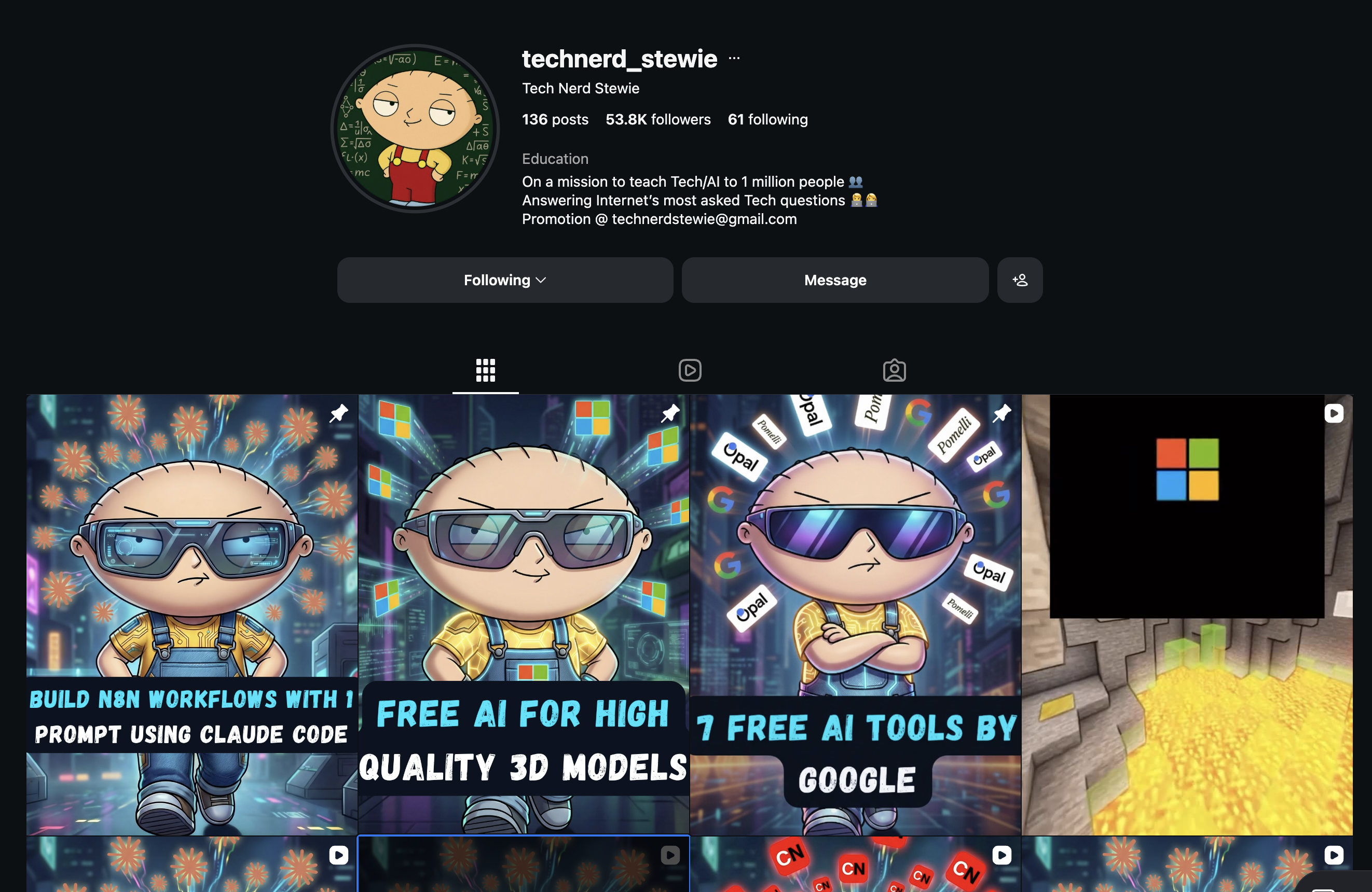 When most people think about building a social media following, they assume you need a ring light, a camera, and the confidence to put yourself on screen. technerd_stewie proves otherwise. With 136 posts and 53,800 followers, this faceless Instagram account has built a massive audience in the AI and tech education niche — and the creator's face has never appeared once.